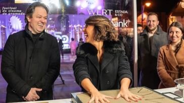 Belíssima e ostentando joias luxuosas, atriz recebeu o Troféu Cidade de Gramado e deixou sua marca na ‘Calçada da Fama’